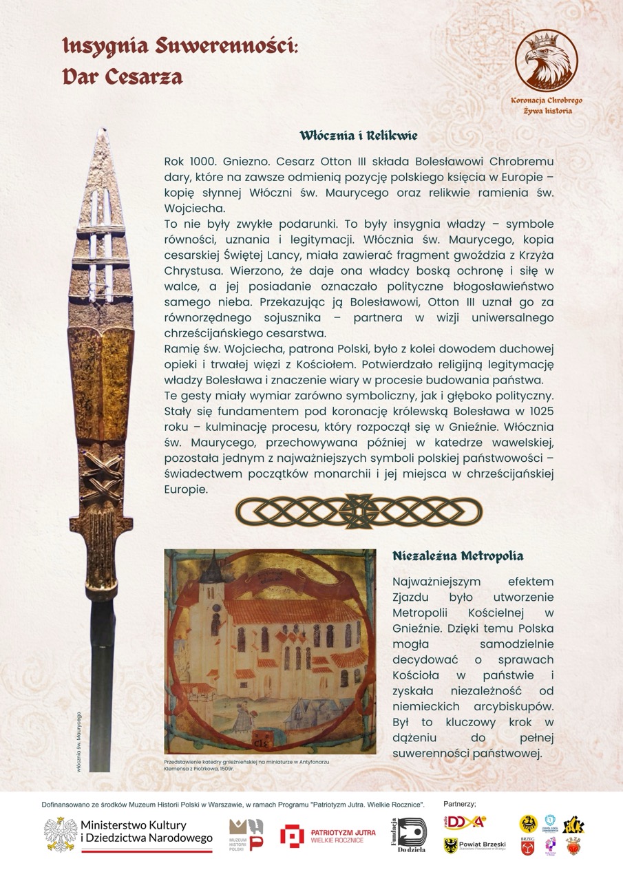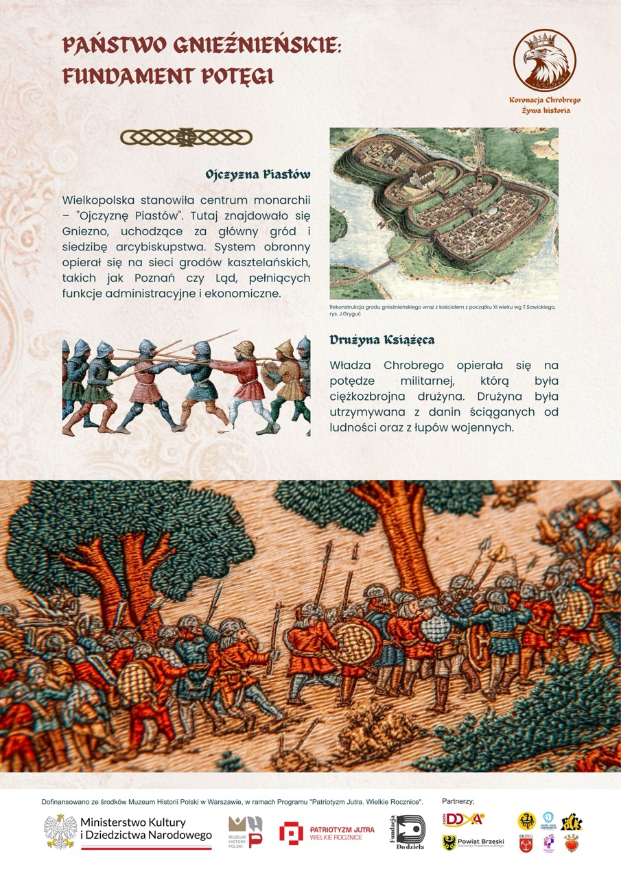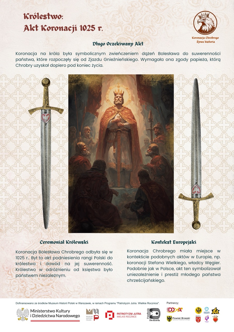 Wystawa powstała podczas warsztatów prowadzonych przez Fundację Do dzieła w Brzegu. Dzieci i młodzież wspólnie z edukatorami opracowali koncepcję dziesięciu plansz, które w przystępny i atrakcyjny sposób przybliżają realia wczesnopiastowskiej Polski, chrystianizację, budowę państwa i znaczenie aktu koronacji z 1025 roku.