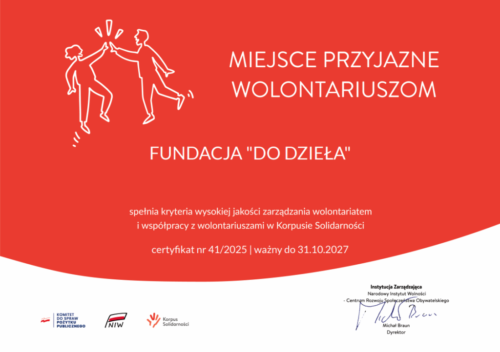 Zapraszamy do współpracy osoby, które chcą stać się cześcią naszego zespołu i chcą się włączyć w działalność organizacji pozarządowej. Pomoc w kwestiach organizacyjnych polega na asystowaniu we wszystkich aspektach działalności Fundacji, zgodnie z indywidualnymi kompetencjami i preferencjami wolontariusza.