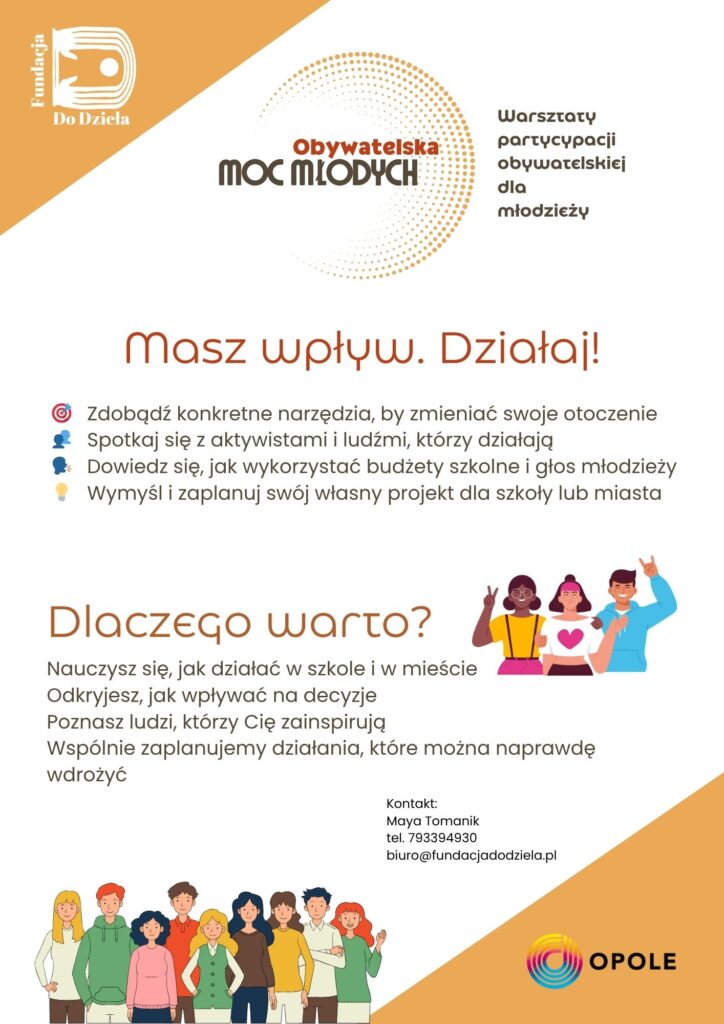 „Obywatelska moc młodych” to cykl bezpłatnych warsztatów partycypacji społecznej dla młodzieży w wieku 13-18 lat z Opola, realizowany w terminie: 05 – 10.12.2025r.